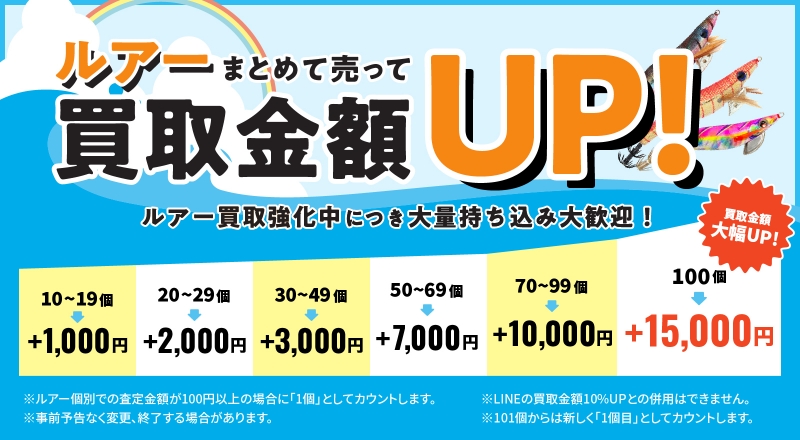 - 特定の魚種が盛り上がるシーズン直前(例:バスシーズン前の春先、エギングシーズン前の秋口)は、業者が在庫を強化するため、高価買取キャンペーンを行う傾向があります。
